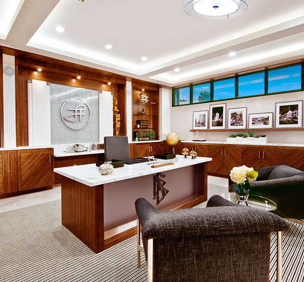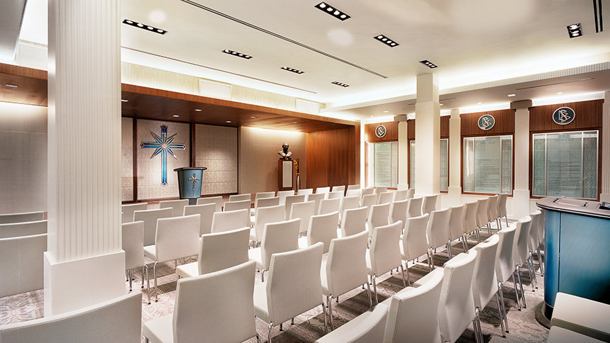 Formerly a functional building annexed to the 1928 Art Deco Cedars of Lebanon Hospital buildings designed by Claud Beelman, the massive reconstruction began in November 2009 and encompasses new walls, all new ceilings and finishes, as well as furniture constructed in-house at the Church’s state-of-the-art custom mill with imported wood and marble from Italy.