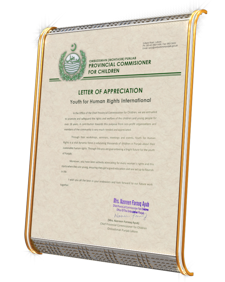 - United for Human Rights enlightening and empowering over 19,000 Pakistani students and subsequently drafting and getting passed, the “Punjab Protection of Women Against Violence Act” to guarantee their rights forevermore.