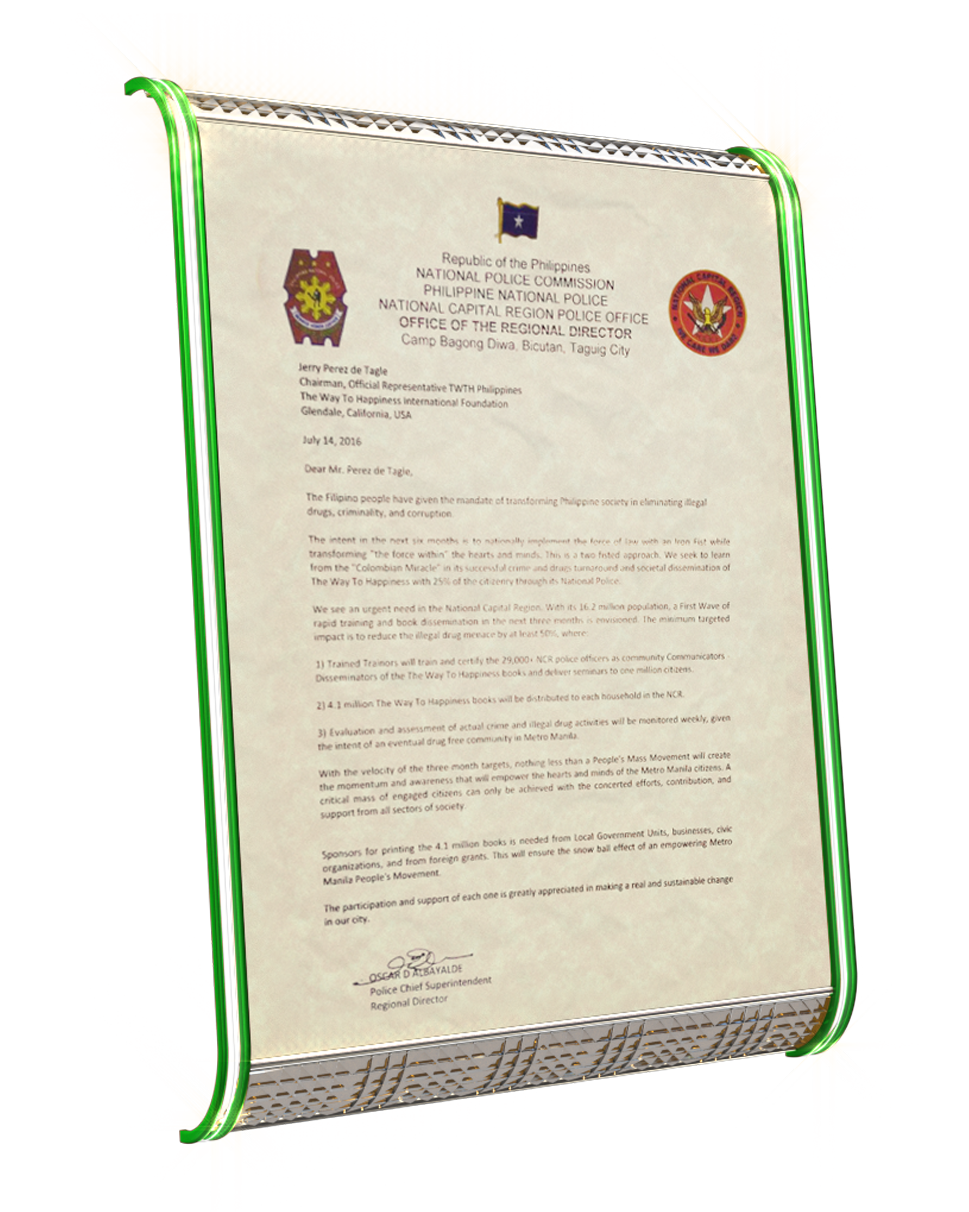 - The Way to Happiness ambassadors entering uncharted territory in the Philippines, sparking widespread adoption to train some 29,000 police officers on the booklet’s universal moral precepts.