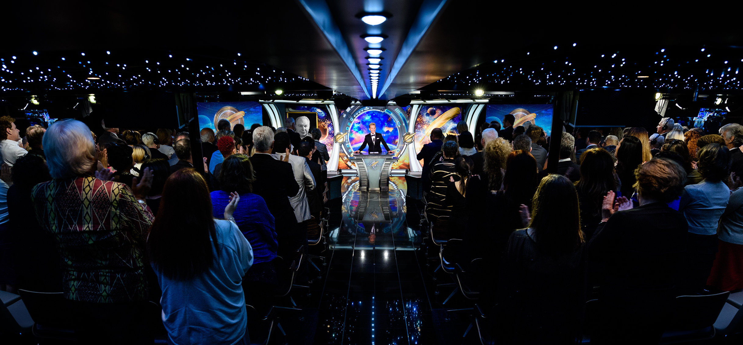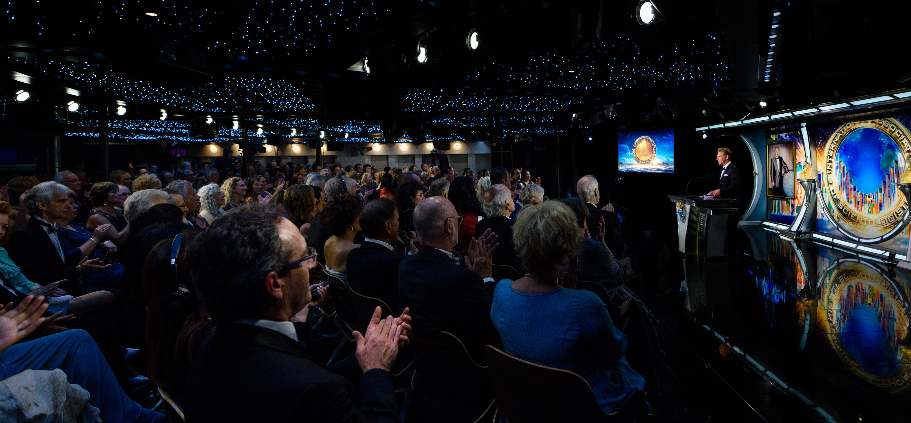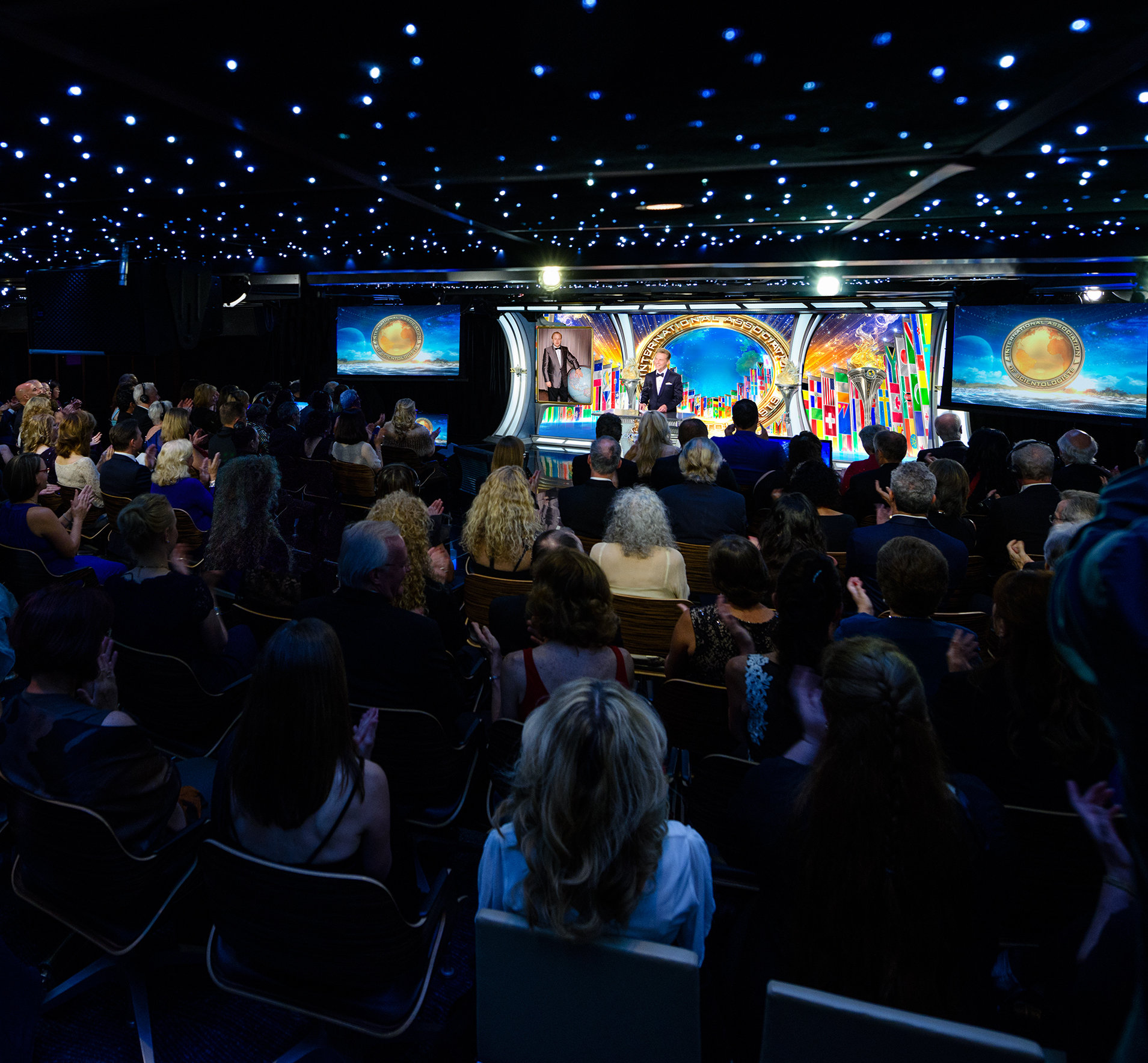 Those aboard for the Maiden Voyage attended a formal event honoring the International Association of Scientologists (IAS), whose mission is to further the social betterment efforts of the religion, support and protect the aims of the religion, and to expand the Church. Among the IAS-supported groups highlighted in the event were: