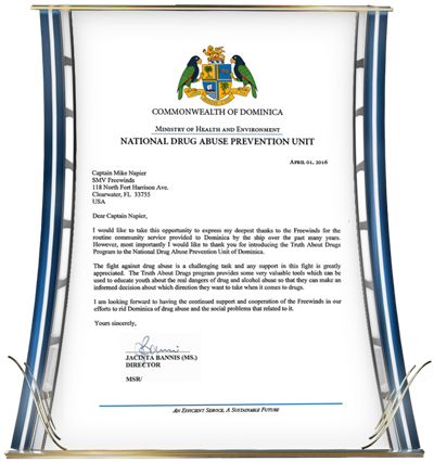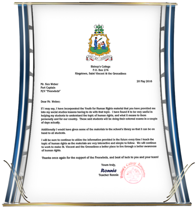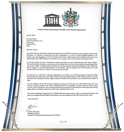 - The Secretary General of UNESCO in St. Kitts giving her “heartfelt gratitude” for the Ship’s “continued Human Rights partnership and making the world a better place.”