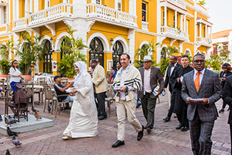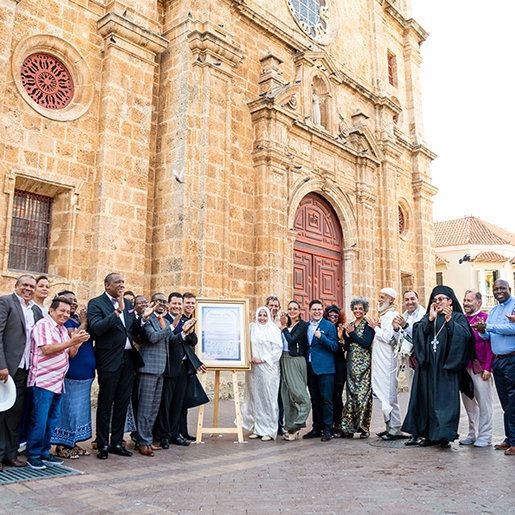 After a welcoming address from Colombia’s Director of Religious Affairs, attendees joined hands in prayer and shortly thereafter walked together from the ship into the Old City of Cartagena to San Pedro Claver Plaza for the signing of an historic interfaith declaration of peace.